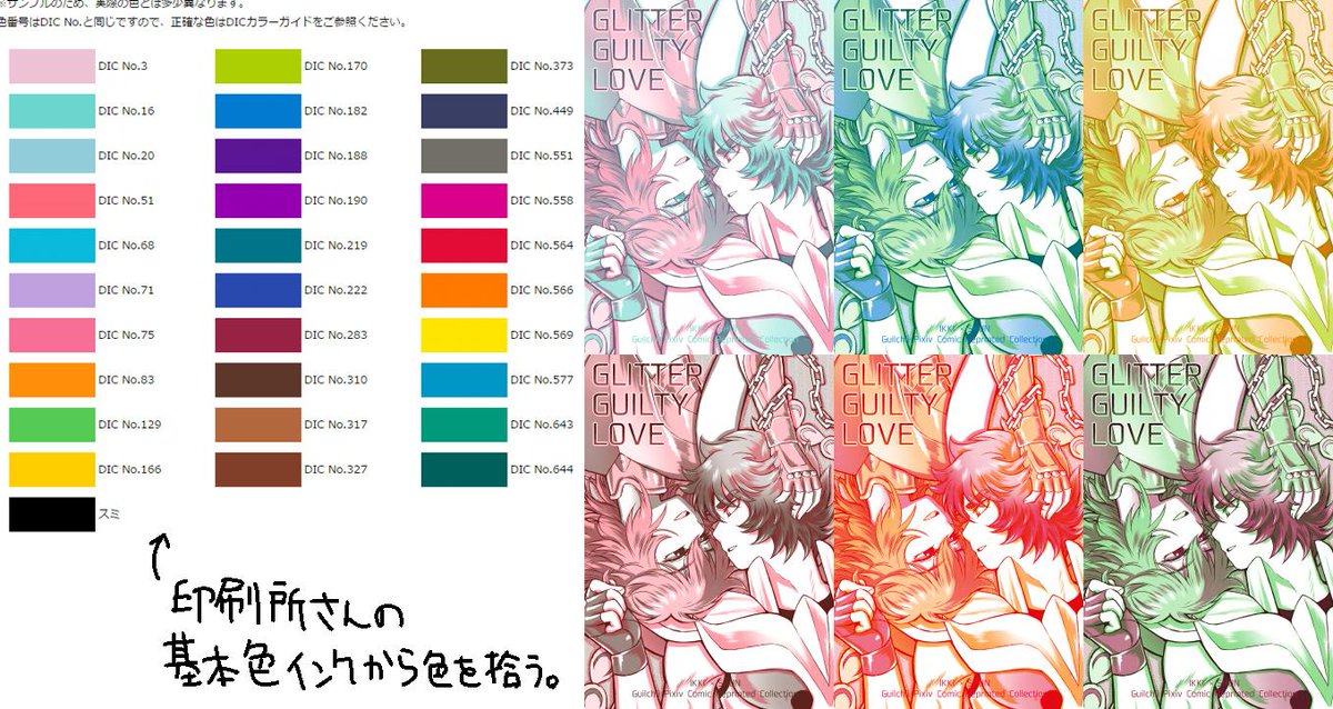 ぎるちぃ On Twitter 今回も表紙は2色刷りなんだけど 2色 原稿制作でいちばん楽しいのが 入稿する印刷所さん ここでは丸正さん のインク見本から色を拾って どの組合せにしよっかな と選ぶとき 理想の配色 且つ過去の本と被らない配色を探すのが難しくて